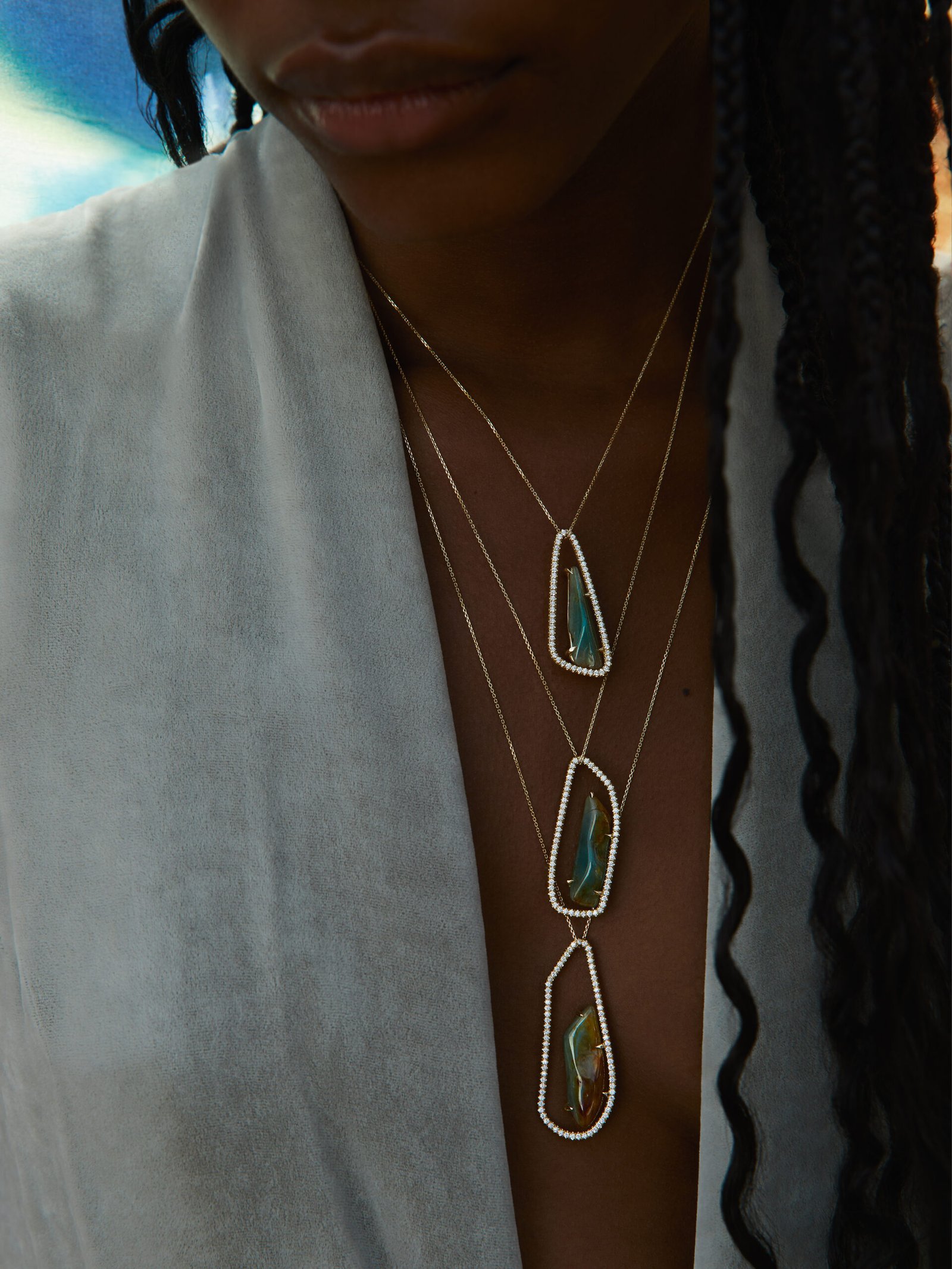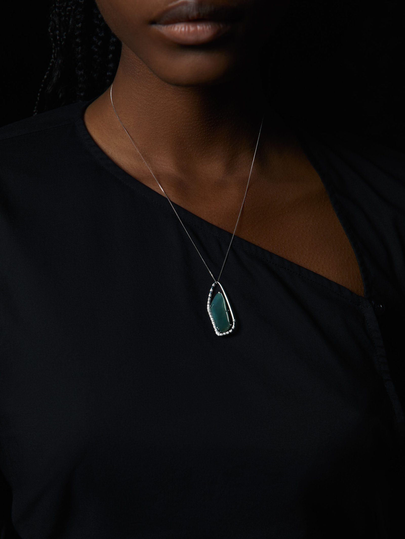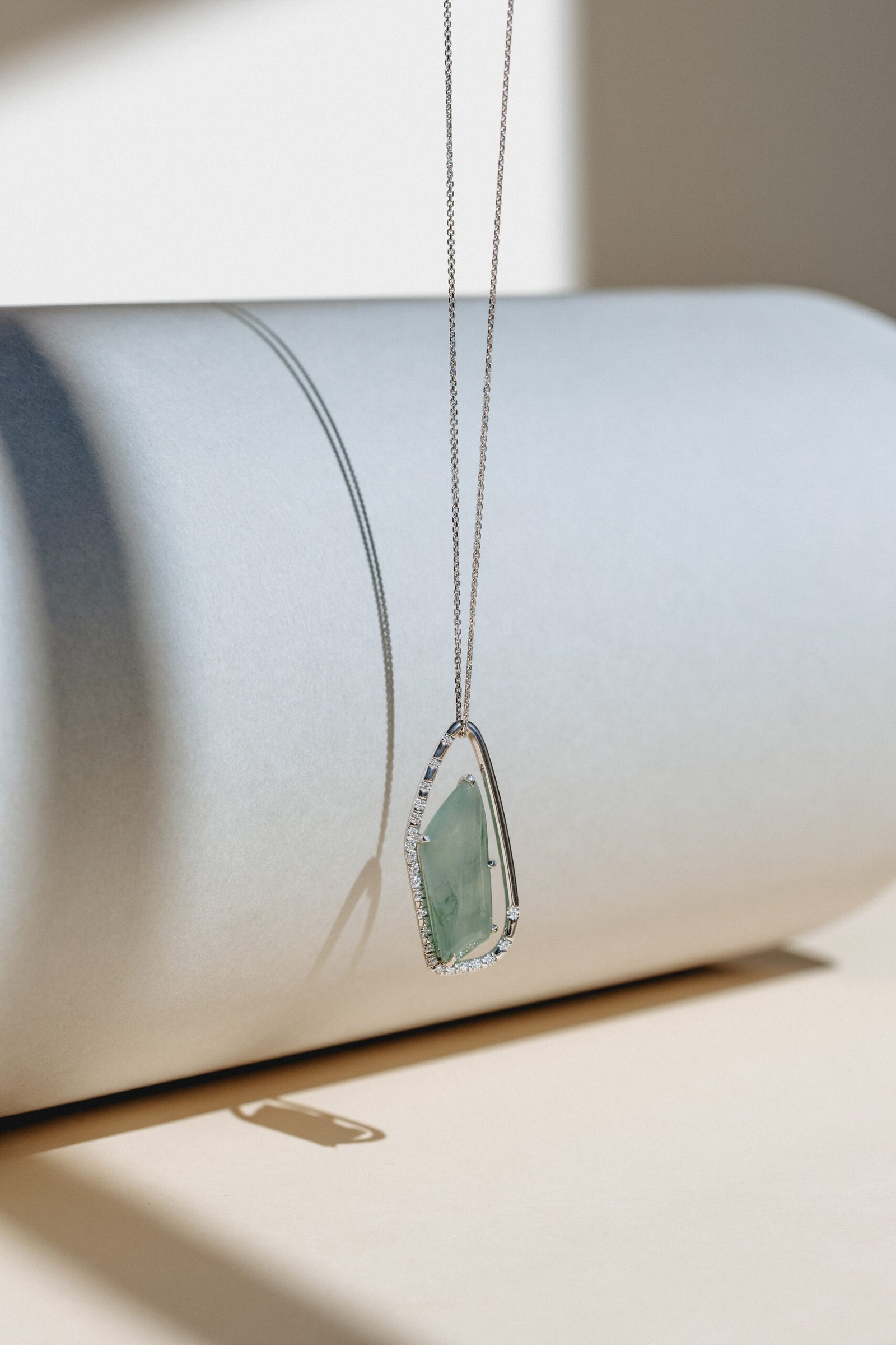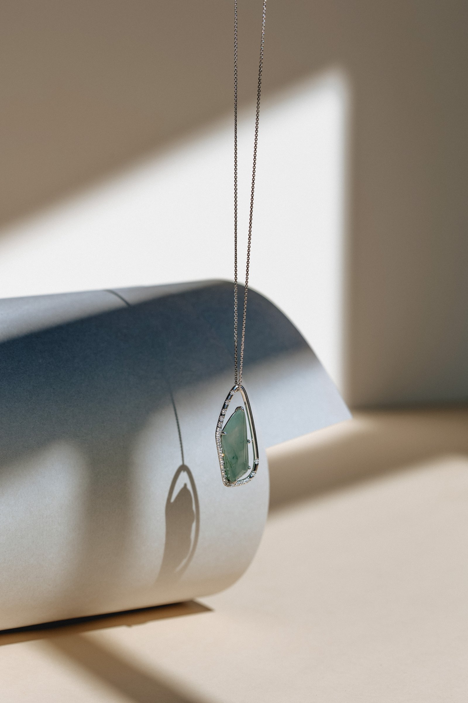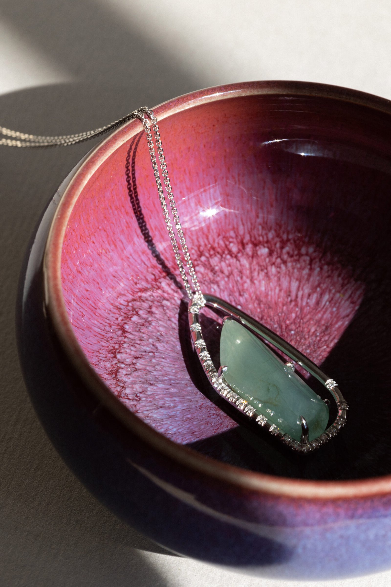The Blue Jadeite and Scattered Diamond Pendant from our Equilibrium collection showcases captivating blue water jade. Its subtle transparency blends with the silver frame scattered with diamonds that surrounds it. The two, much like Yin and Yang, represent a sense of balance and harmony.