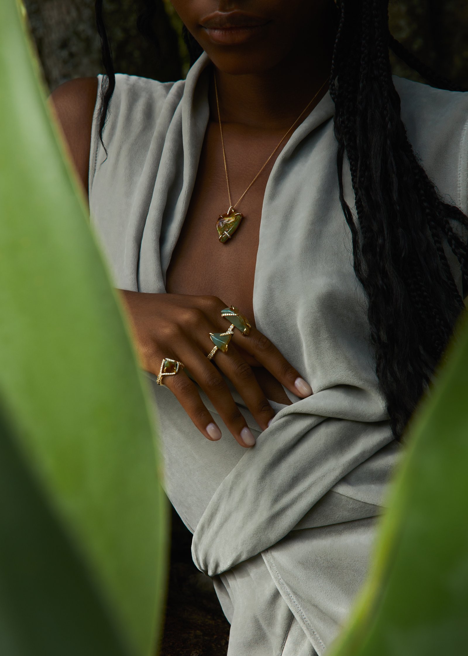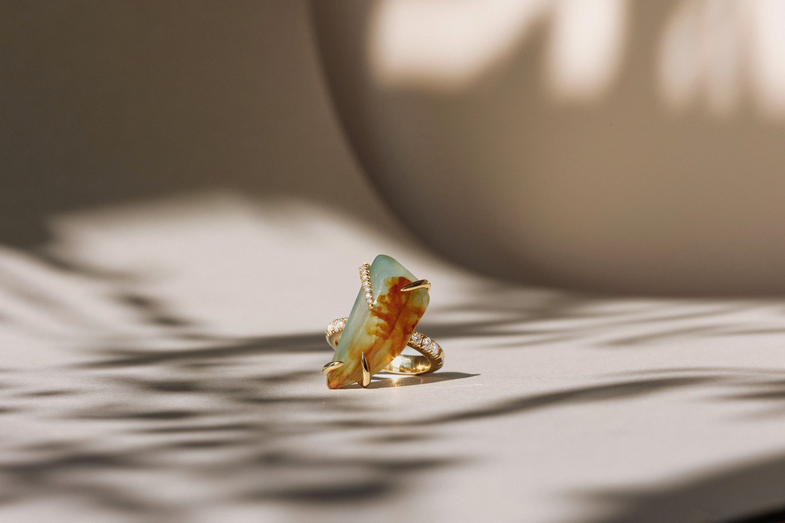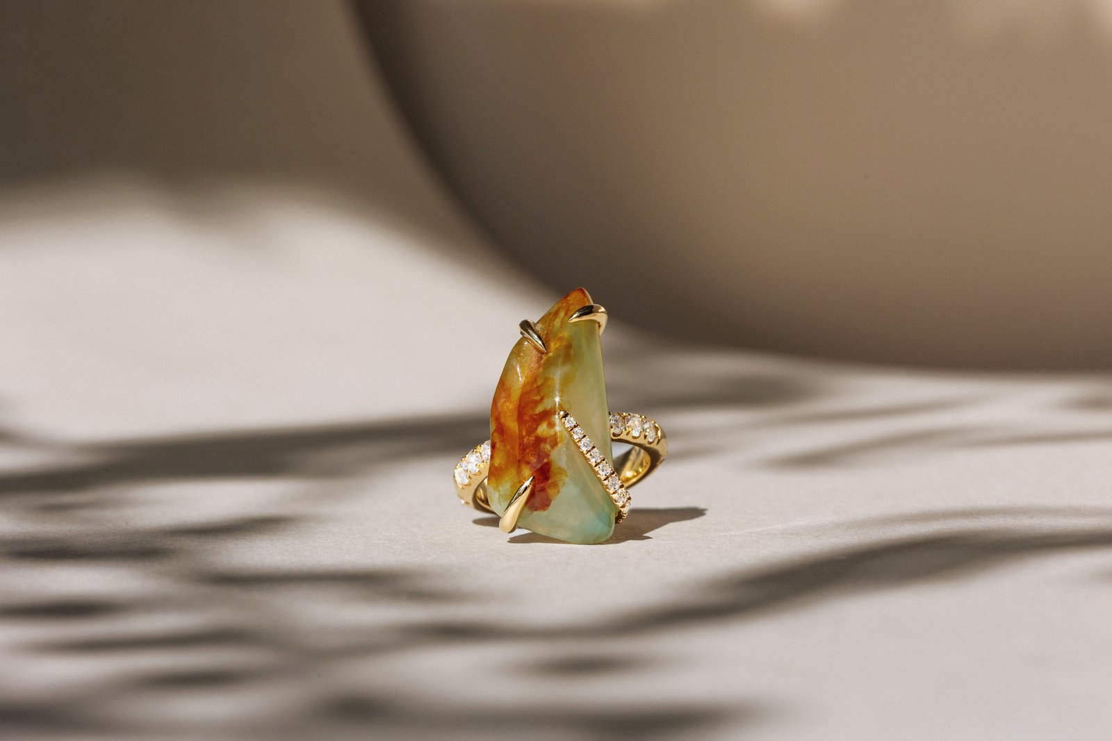 The Jadeite Diamond Claw Ring from our Whisper collection combines the transparency of blue water jade with the decadent richness of yellow jade, for a captivating blend of colours. Sharp yet delicate claws scattered with round brilliant diamonds hold the precious stone in place, showcasing its statement allure.