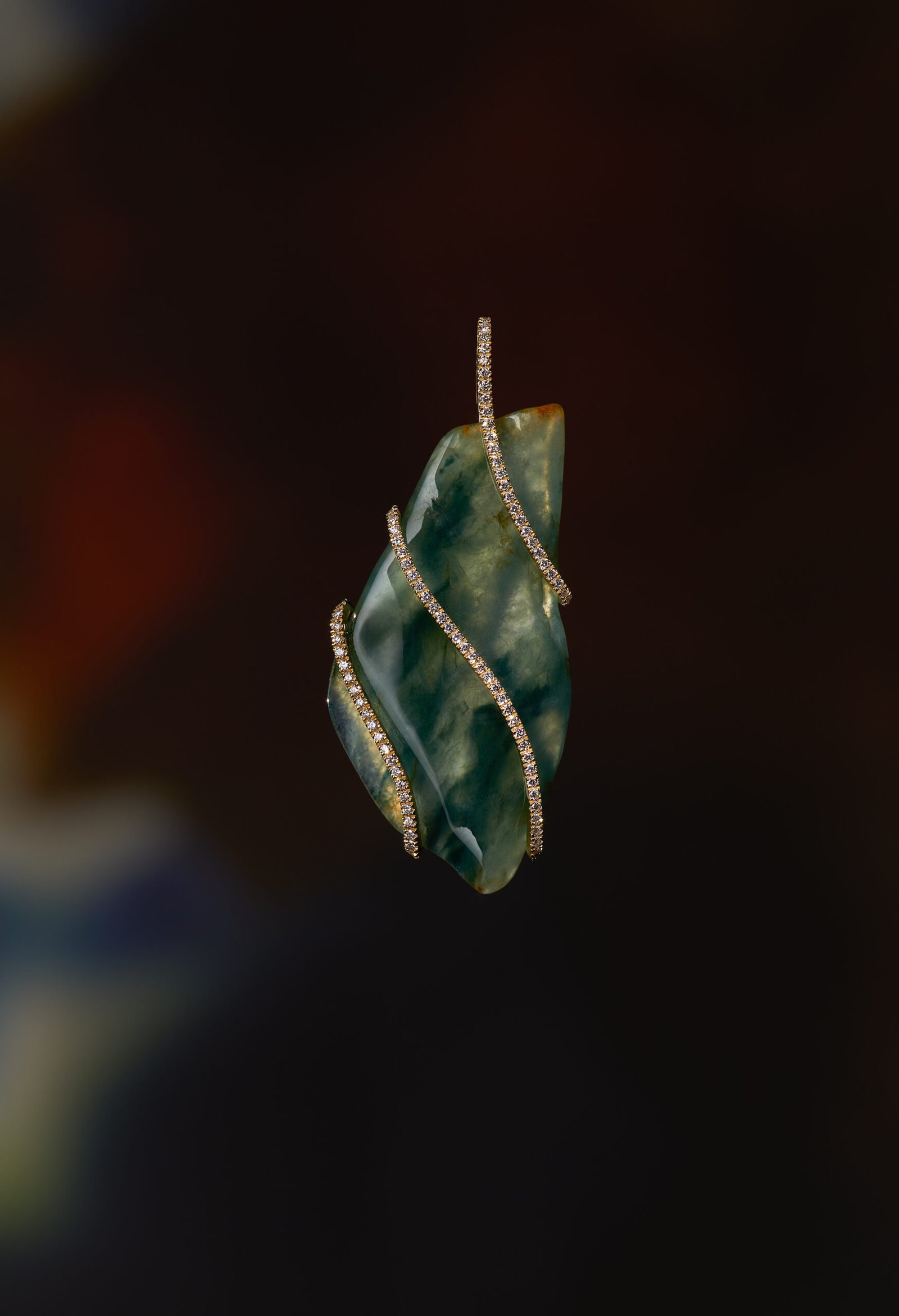 The Tarana pendant from our Serendipity collection. The transparent beauty of blue water jadeite is gently embraced by graphic diamond lines. This piece of blue water jadeite traps a colorful world in itself. This green jadeite is like a vibrant plant, growing and changing from all angles, creating endless room for imagination. Simple and exquisite, it provides an elegant choice for any occasion.